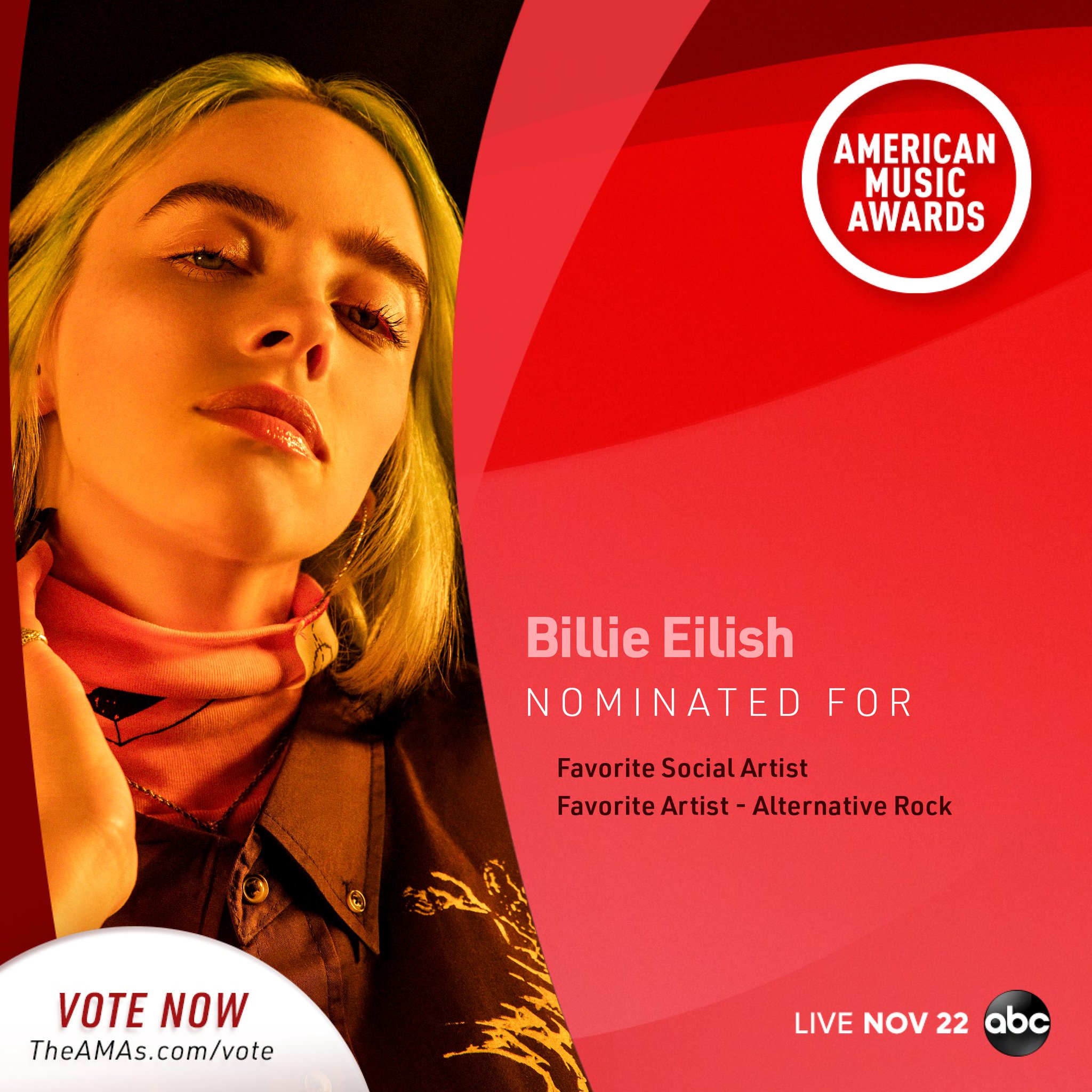 Voting is open for all AMA categories. Billie Eilish joins Billboard on the red carpet of the 2019 American Music Awards to talk about her SIX Grammy nominationsBillieEilish AMAs Billboard Am.